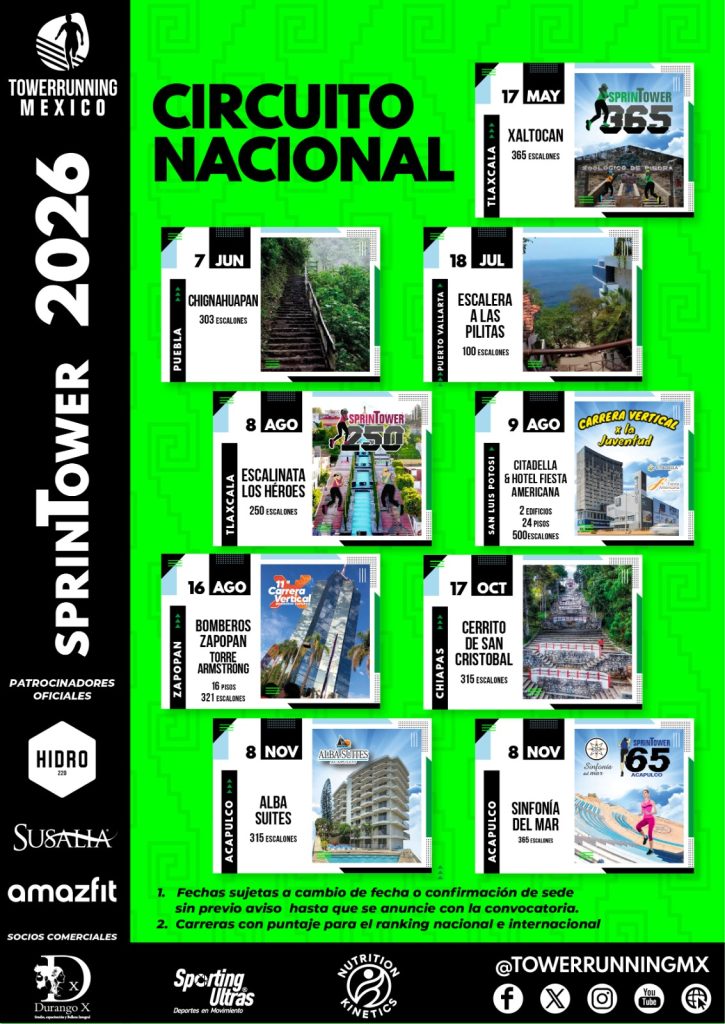 Tower Running México esta incorporado a Tower Running World Association (TWA), organismo mundial rector de esta disciplina. Tower Running México gestiona las carreras en suelo mexicano que pertenecen a las carreras más prestigiosas del mundo participando en el ranking mundial, campeonatos nacionales y continentales.