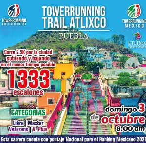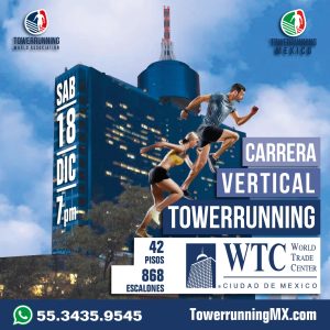 2020◄ ►2022 5a. ed. Tower Running WTC Ciudad de MéxicoDiciembre 18, 2021Ciudad de México 42 pisos,868 escalones Resultados Fotografías Carrera Vertical Playa SuitesOctubre 31, 2021Acapulco, Guerrero 2 edificios2 ascensos2 descensos72 pisos1296 escalones Resultados Fotografías SprinTower Sínfonia del Mar, AcapulcoOctubre 30, 2021Acapulco, Guerrero 65 escalones Resultados Fotografías Run Up Krystal Beach AcapulcoOctubre 29, 2021Acapulco, Guerrero 2 ascensos, 1 descenso59 pisos999 escalones Resultados Fotografías Tower Running Trail AtlixcoOctubre 03, 2021Oriental, Puebla 3K + 1333 escalones Resultados Fotografías 7a. ed. Carrera Vertical Bomberos ZapopanAgosto 15, 2021Zapopan, Jalisco 12 pisos312 escalones40 mts de altura Resultados Fotografías Tower Running Oriental PueblaAgosto 08, 2021Oriental, Puebla 400 mts planos + 1297 escalones Resultados Fotografías 2020◄ ►2022