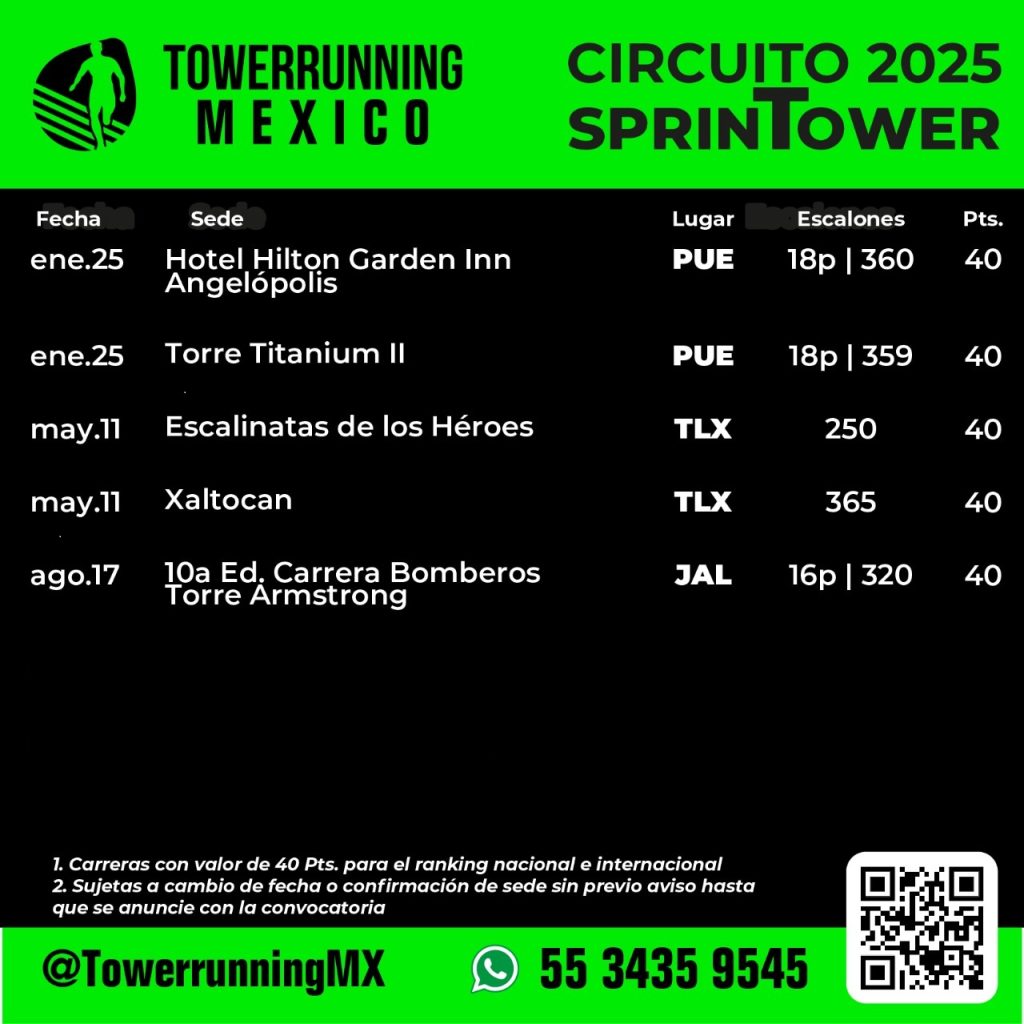 Ranking Circuito SprinTower Todos los corredores nacionales y extranjeros que deseen participar en el Circuito Tower Running SprinTower están invitados, Circuito de velocidad en escaleras con carreras de menos de 499 escalones 2025 2025 Ranking 2025 Campeón Varonil:.Fernando Carreño OrtizCampeón Femenil:.Jessica Velez GutierrezRanking por Categoría: Ranking General: